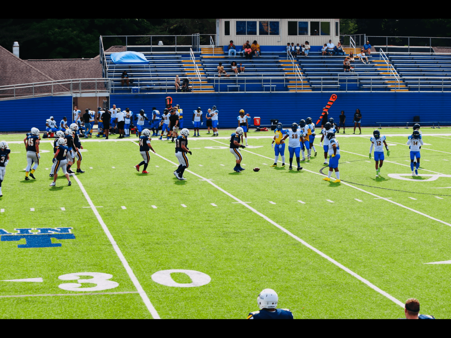 We have a large athletic field with locker rooms and tiered bleacher seating.